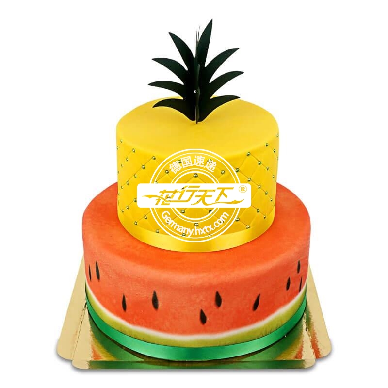 描述: 蜜瓜菠萝生日蛋糕、样式如图(26+18cm)。